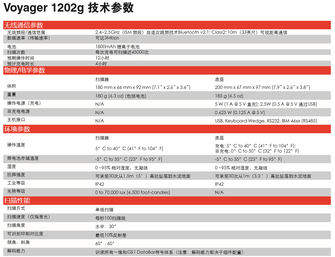 霍尼韋爾VoyagerTM單線激光掃描器采用自由的藍(lán)牙無線連接技 術(shù),并提供可現(xiàn)場更換的電池,能夠更加快速方便地更換。世界知名 Voyager系列掃描器備受用戶期待便是強(qiáng)勁的一維條碼掃描性能,新 成員1202g也同樣擁有。