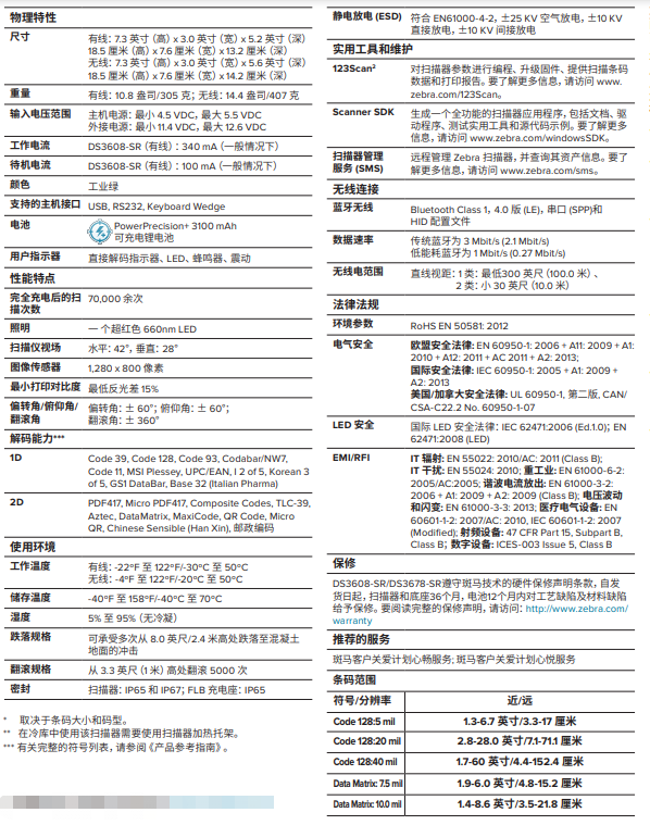 為了保證產(chǎn)品質(zhì)量,及時(shí)交付訂單,您的倉庫和生產(chǎn)車間的員工們每天要掃描成千上萬個(gè)條碼。這些員工的工作效率完全取決于您為他們購買的掃描器的質(zhì)量。如果您的員工需要采集標(biāo)準(zhǔn)范圍的 1D 和 2D 條碼,您可以為他們配備有線的 DS3608-SR 和無線的 DS3678-SR 掃描器,這兩款掃描器均采用了無與倫比的耐用性設(shè)計(jì),擁有卓越的掃描性能和卓越的可管理性,無疑將成為您員工手中所向披靡的利器。先進(jìn)的掃描儀可以快如閃電地采集任何 1D 或 2D 條碼,無論這些條碼是標(biāo)簽(不管標(biāo)簽發(fā)生什么情況)條碼,還是屏幕條碼,從緊貼鏡頭到將近 5 英尺/1.5 米的范圍內(nèi),均可輕松采集。超耐用設(shè)計(jì)使這兩款產(chǎn)品可以在幾乎任何環(huán)境下應(yīng)用自如,尤其適合在惡劣環(huán)境下使用。DS3608-SR/DS3678-SR 的部署和管理都非常方便,可以大大節(jié)約時(shí)間。在無線技術(shù)方面,DS3678-SR 獨(dú)具特色,采用了一整套解決方案,包括密封的耐用型充電座,智能電池和斑馬技術(shù)自有的用于防止干擾 Wi-Fi 網(wǎng)絡(luò)的 Wi-Fi 友好模式。DS3608-SR/DS3678-SR — 具備您所需要的不間斷性能,可以全面提高員工的工作效率和產(chǎn)出量。