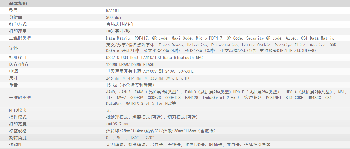 • BA410支持高達(dá)8IPS的打印速度并配置了128MB內(nèi)存空間,能支持TTF和OTF字體擴(kuò)展功能,諸多強(qiáng)勁性能結(jié)合伴您業(yè)務(wù)成長。