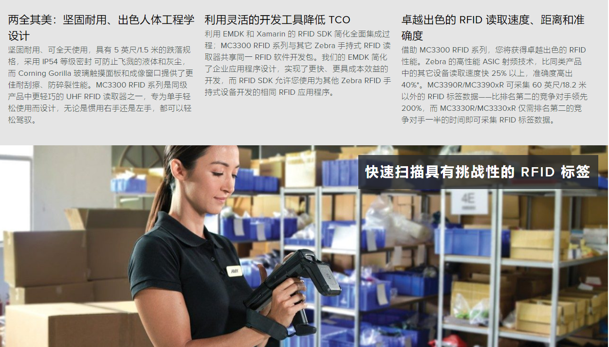 RFID 為庫(kù)存和資產(chǎn)管理、訂單履行等帶來了全新水準(zhǔn)的高效率。要更大限度地提高工作效率,您要為員工提供一種能為 RFID 應(yīng)用帶來更 佳舒適度、更高的任務(wù)速度、更好的易用性以及準(zhǔn)確性的設(shè)備。MC3330R 手持式 RFID 讀取器可以幫助解決這一切。您可獲得 Zebra 工業(yè) 手持式設(shè)備的標(biāo)志性耐用設(shè)計(jì),更大限度地確保設(shè)備正常的運(yùn)行時(shí)間。MC3330R 是同類設(shè)備中極為輕巧的設(shè)備之一,同時(shí)采取正確的人 體工程學(xué)設(shè)計(jì),可確保全天舒適使用。RFID 讀取性能和接收器靈敏度可快速、準(zhǔn)確地掃描極具挑戰(zhàn)性的 RFID 標(biāo)簽。員工可隨指隨 掃,輕松讀取 RFID 標(biāo)簽和條碼。而且,您可開發(fā)直觀的 Android 應(yīng)用程序,以充分利用 MC3330R 強(qiáng)大的計(jì)算平臺(tái)、寬大觸摸屏和物理鍵 盤。MC3330R — 手持式 RFID 讀取器的新一代發(fā)展方向。